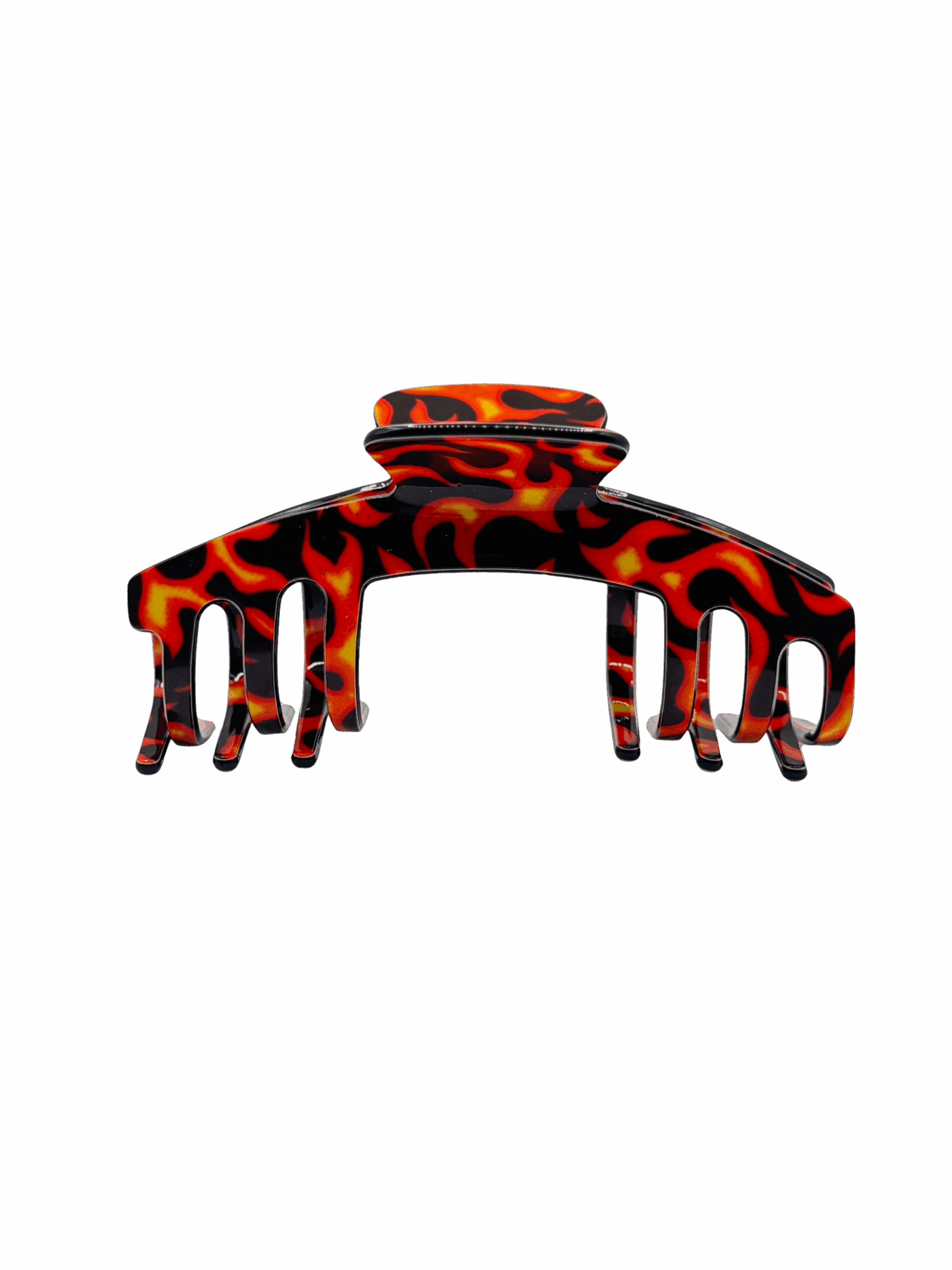 Flame-inspired hair claw with fiery edges, adding a bold, edgy spark to any hairstyle.