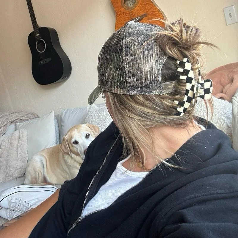 Checkered black and white hair clip with a bold, retro vibe for a vibrant look.